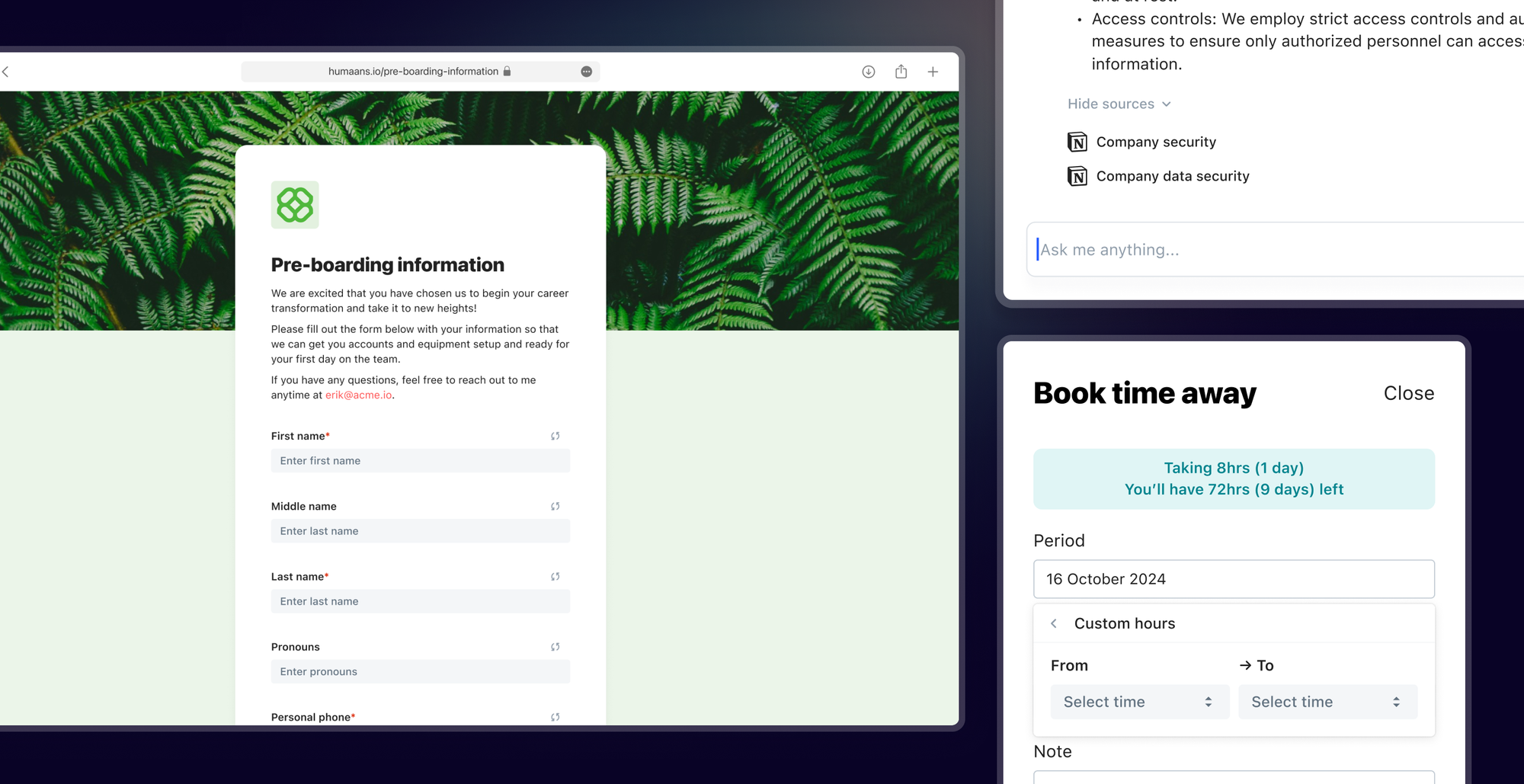 Product UpdatesProduct Update: Hourly Time Away Policies, Custom Compensation, Workflow Forms, Notion Integration for AI & MoreWe're thrilled to introduce a new round of updates aimed at enhancing your experience with Humaans.