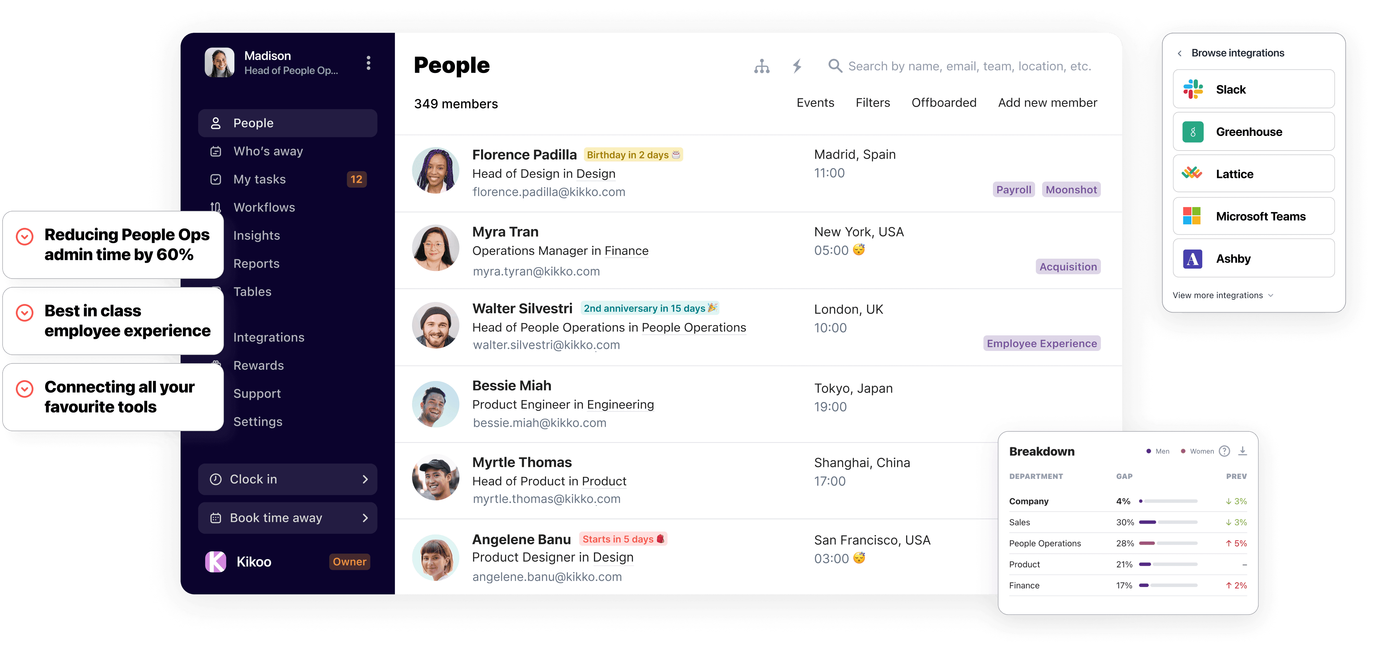 Your company names and faces at a glance. Stay informed with the employee directory, upcoming events, anniversaries, birthdays and the who's away view. Who’s leaving next week? Who’s joining this month? Are any visas expiring soon? Don’t chase – let Humaans tell you at the right time.